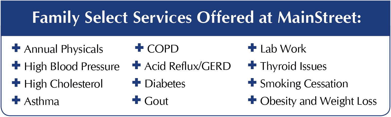 Are you the new neighbors on the street? We want you to know that you can rely on the MainStreet Family for all of life’s little emergencies. To make life a little easier, we’re excited to offer primary care for our patients as well! We’re here for life’s bumps and bruises and now we can help with your annual checkup or your high blood pressure too. We believe that all visits to the doctor’s office should be as quick and convenient as your urgent care visits. That’s is why we offer primary care appointments 7 days a week, including our extended hours!